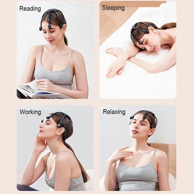 BM34 head massager has 8 massage arms with 8 individual motors, providing 360 degree massage coverage with various vibrating patterns. Have a hands-free massage while reading, working, or enjoying your coffee. it presses the head muscles to help relax and reduce stress and tension.