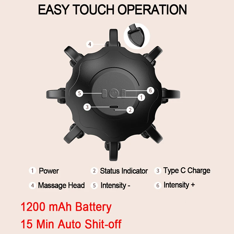 Auto-off safety feature: Auto-off after 15 minutes of continuous use, press and hold the power button again to restart another 15-minute massage, trade no more than 30 minutes for one use.